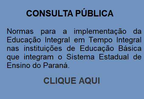 O Conselho Estadual de Educação do Paraná coloca em Consulta Pública a minuta da Deliberação que estabelece as normas para a implementação da Educação Integral em Tempo Integral nas instituições de Educação Básica que integram o Sistema Estadual de Ensino do Paraná.