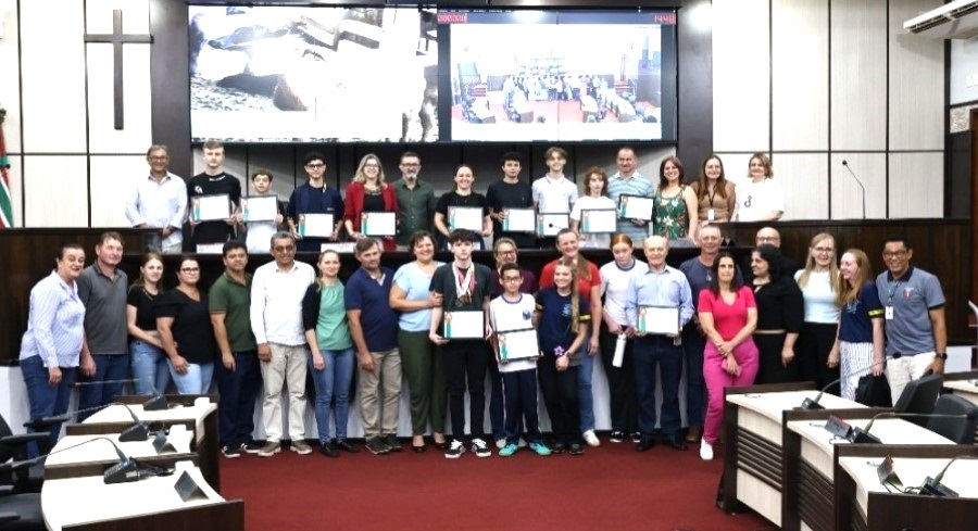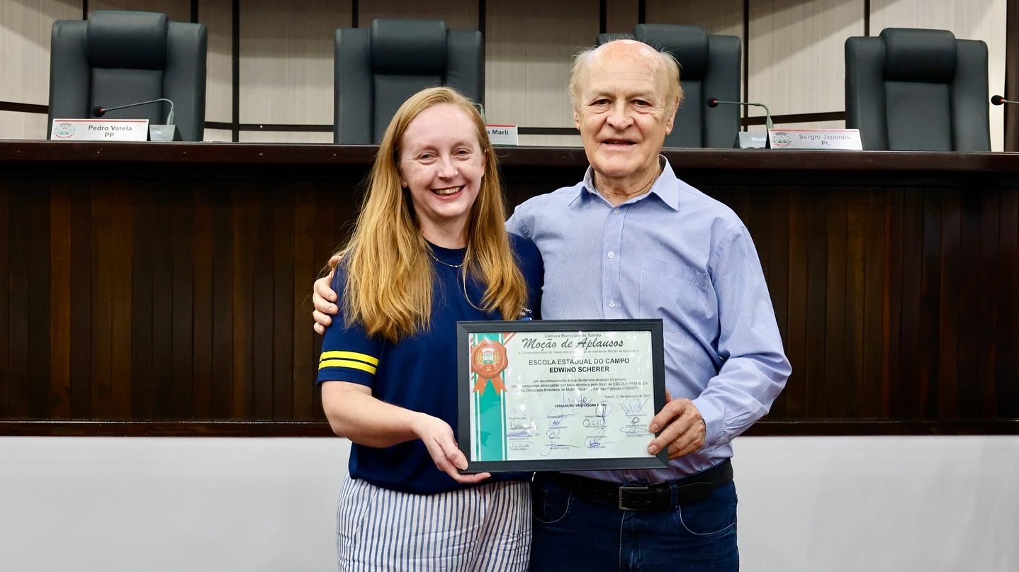 Durante a solenidade, também foi entregue a homenagem Moção de Aplausos à Escola Estadual do Campo Edwino Scherer, instituição com mais de 70 anos de história no distrito de Dois Irmãos, símbolo do compromisso comunitário e da excelência no ensino, que recebeu este nome em homenagem pelo trabalho pioneiro que o pai do Conselheiro Flávio Vendelino Scherer realizou na área educacional naquele lugar.