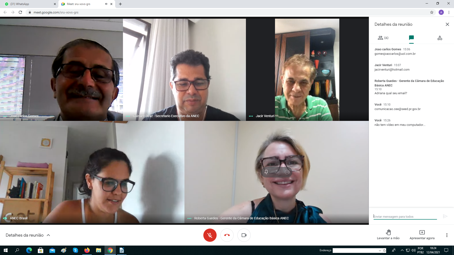 O Presidente do Conselho Estadual de Educação do Paraná, Prof. João Carlos Gomes, e o Vice-Presidente, Prof. Jacir José Venturi, participaram, no dia 12 de abril de 2021, de uma reunião com a Associação Nacional de Educação Católica do Brasil (ANEC) para tratar dos direitos de Aprendizagem das infâncias e juventudes em tempos de Pandemia, mais especificamente sobre o Ensino Domiciliar.